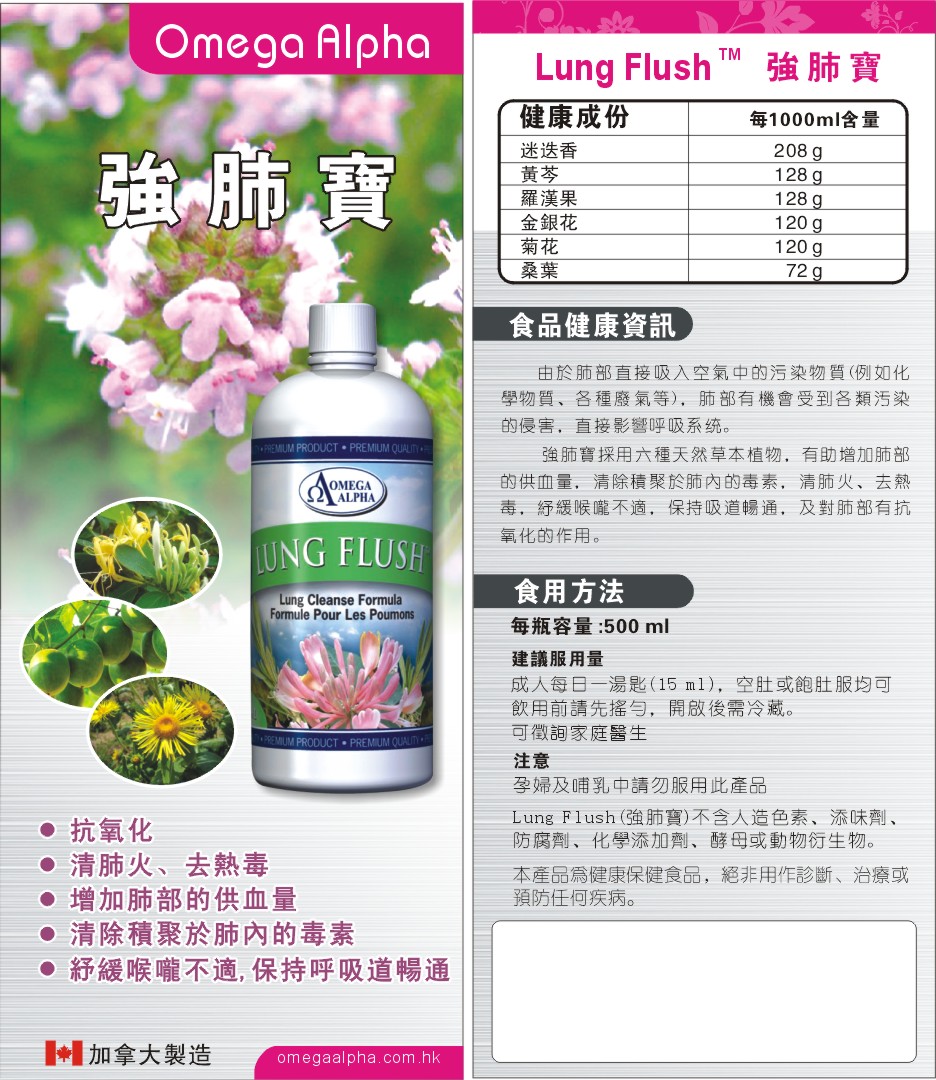 強肺部採用六種天然草本植物,有助增加肺部的供血量,清除積聚於肺內的毒素,清肺火、去熱毒,紓緩喉嚨不適,保持呼吸道暢通,及對肺部有抗氧化的作用。